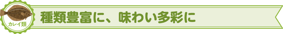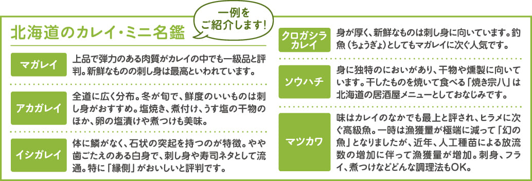 安定した漁獲量を誇る北海道のカレイ類。魚種が豊富で、漁場は北海道全域に広がっています。種類によって味わいも多彩ですが、平均して脂肪が少なく淡白な味わいは日本人好み。年間を通して漁獲される北海道のカレイ達。カレイなるおいしさを食べ比べるチャンスです。